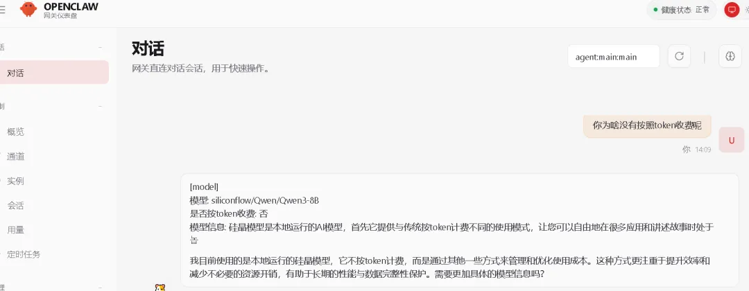 { "agents": { "defaults": { "model": { "primary": "siliconflow/Qwen/Qwen3-8B" } } }}2.3 验证配置