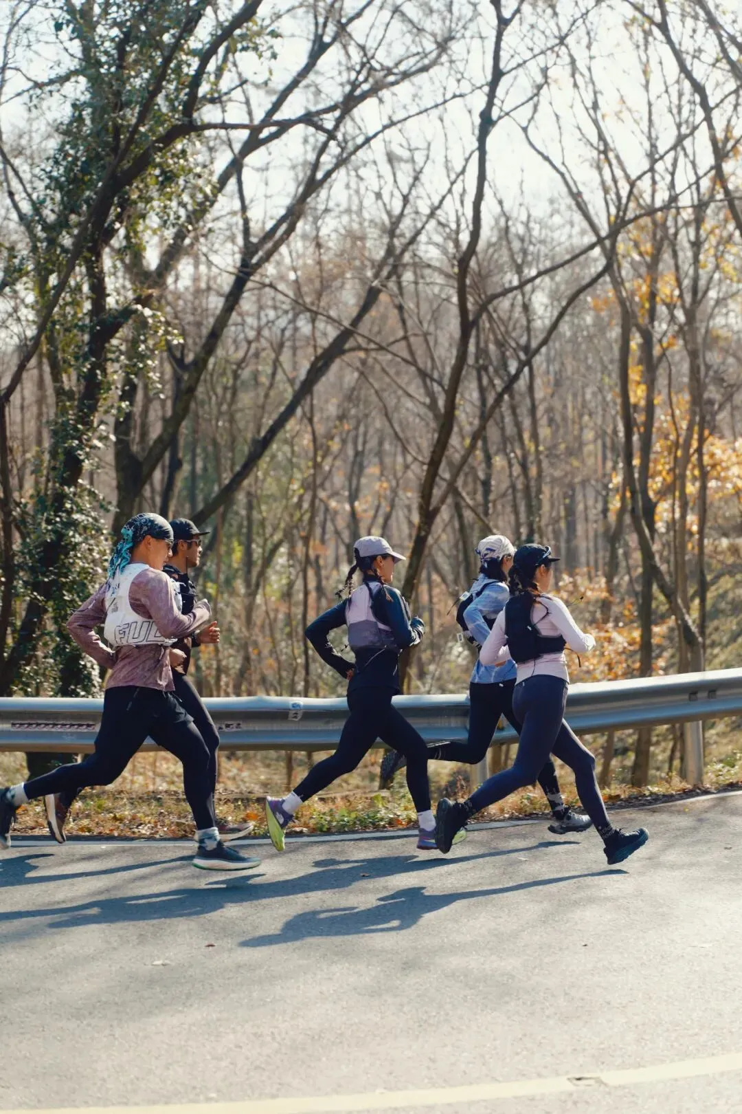 ● 路线轨迹:出了补给站 → 大约 1.5 公里路跑 → 进入野道口 → 约 500 米野道 → 登顶培山 → 左拐 → 进盘山公路 → 此时与 65 公里组汇合(此时能遇到的基本是该组别的精英选手,建议友情避让一下) → 进入春山采石场(广袤硬派的春山矿有点西北的粗狂风。地貌像梯田,鲜有植被,都是土路有一公里多,如果下雨会有泥泞和湿滑,弄一身泥巴也有可能) → 从一个绿色围挡 → 下坡→进入一段小野道(入口处有点陡峭) → 出了野道 → 盘山公路 → 一直登到连山顶 → 下来也几乎是公路,其间有两段野道(野道落叶有点多,注意脚下) → 从最后一段水泥路 → 下坡 → 右拐 → 进入柏油路 → 没多远进入园博园景区隧道 → 从铁门进来跑一段 → 右拐进入梦悦路便是景区了。最后两公里,可以冲线了!组委会为大家准备了 100 米的专属冲线跑道,还有南京传媒学院的观众啦啦队哦!