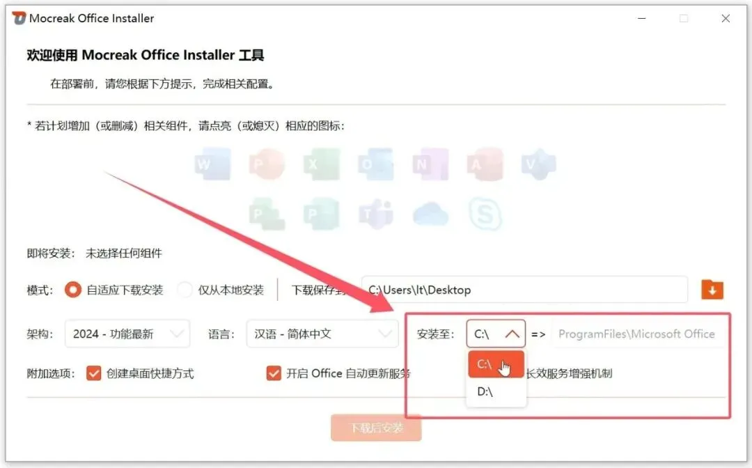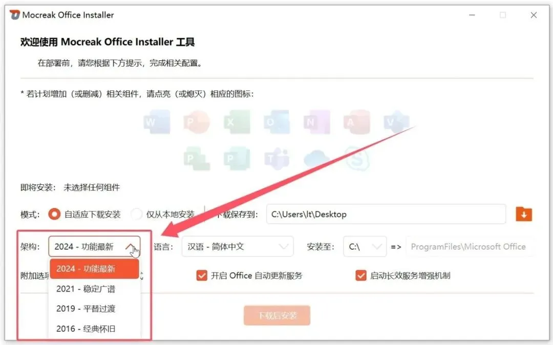 在架构选项中,可选择您需要下载的 Office 版本,本工具支持 Office 2016、2019、2021、2024 四个版本的下载与安装。 「安装至这里」选项用于选择 Office 软件的安装存放路径,若您的 C 盘可用空间不足,建议选择 C 盘以外的其他磁盘分区进行安装。 完成版本与安装路径的选择后,可在相关组件板块中,勾选您需要安装的 Office 组件,建议根据自身使用需求选择对应组件进行安装,避免软件冗余臃肿。 所有配置确认完成后,点击下载后安装按钮即可启动对应流程;工具下载速度稳定,全程将自动完成 Office 的安装部署,用户仅需等待流程执行完毕即可。 安装完成后,电脑桌面会生成已安装的 Office 组件图标,你可任意打开其中一个组件,验证软件是否正常安装并启用。 无需进行账号登录操作,点击软件界面内的「账户」选项,即可看到软件已处于可正常使用的无限制状态,至此,整个 Office 安装流程全部完成。 软件获取