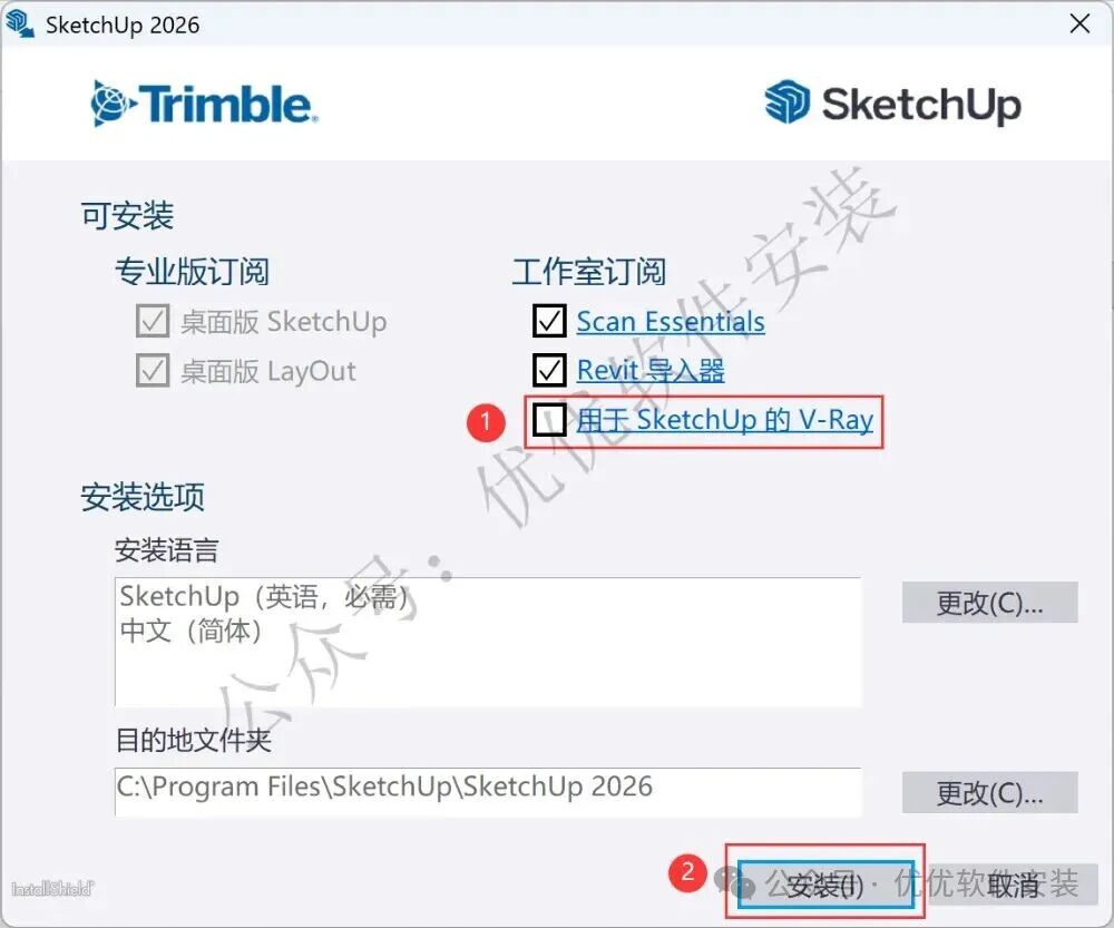 4、不勾选【用于SketchUp的V-Ray】,再点击【安装】