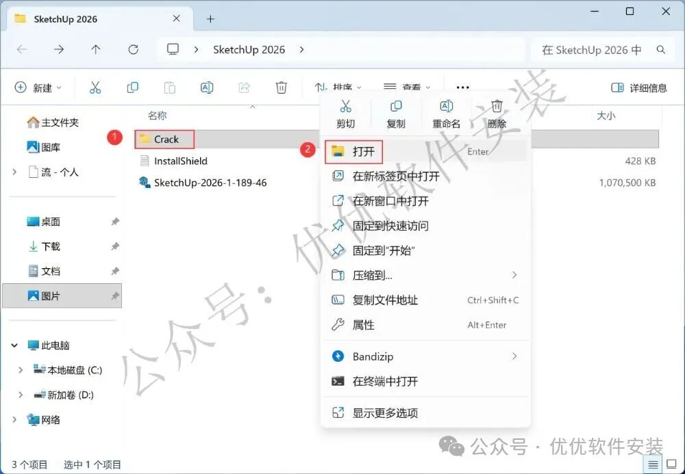 7、回到SketchUp 2026文件夹,找到【Crack】文件夹,右键【打开】它
