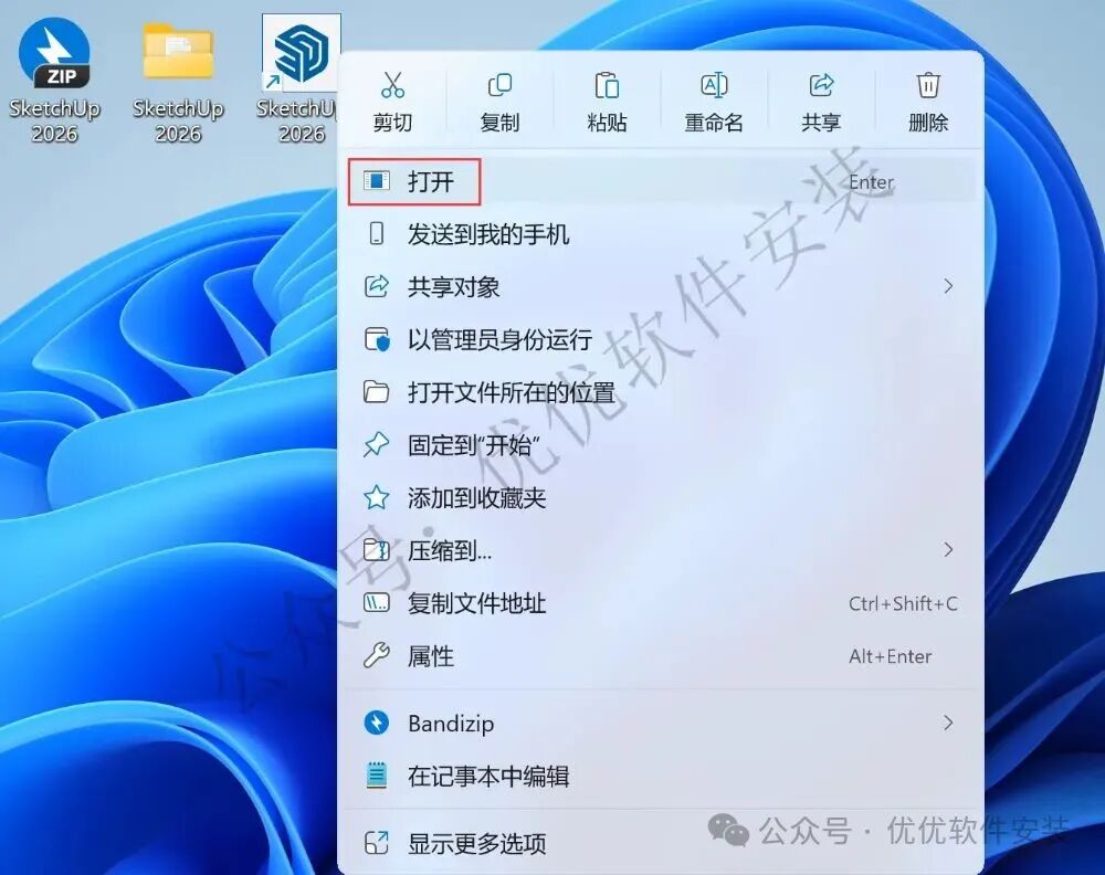 14、回到桌面,右键桌面上的【SketchUp 2026软件图标】,点击【打开】
