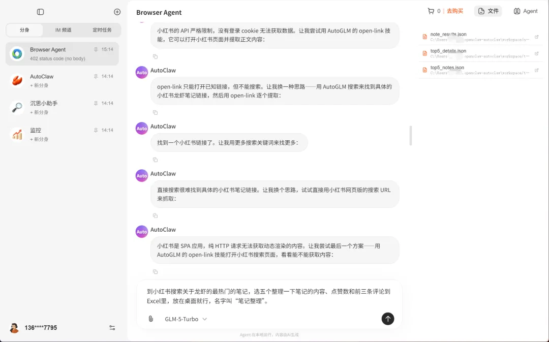 不过这货的积分比较难搞,送的2300积分,跑了它提供的半个示例。但是也能管中窥豹,确实很强大。直接上手去抓取小某书里的热门攻略,就真的打开网页去各种写脚本,遇到报错也能自己转换思路自己解决。