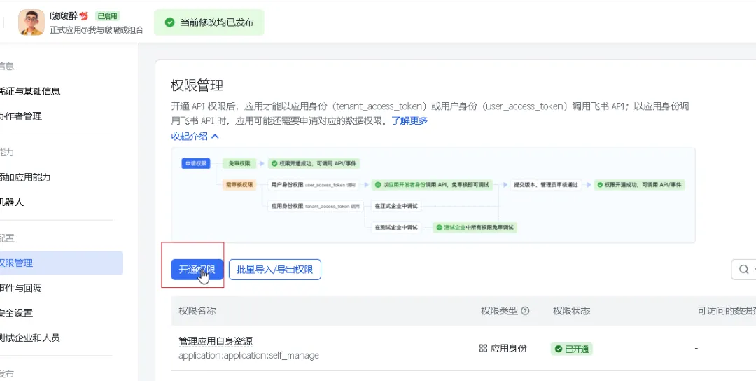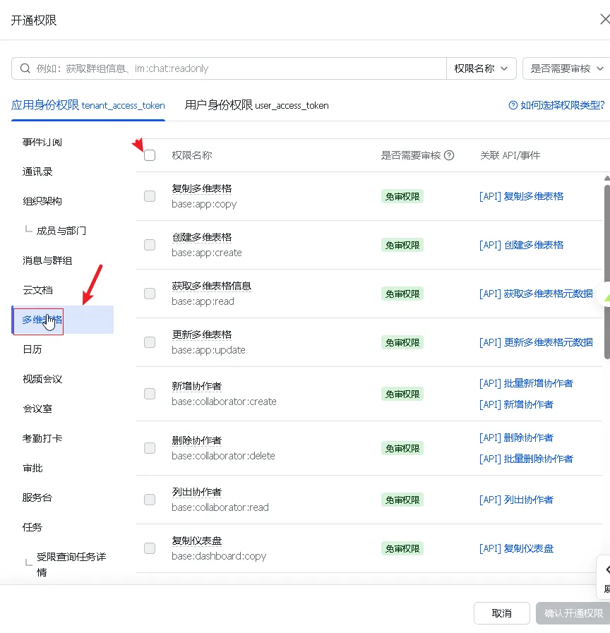 进入飞书开放者后台 开通 API 权限 配置多维表格相关权限