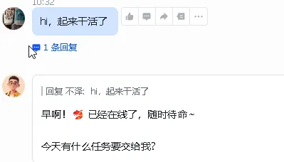 “早啊!🦐 已经在线了,随时待命~ 今天有什么任务要交给我?