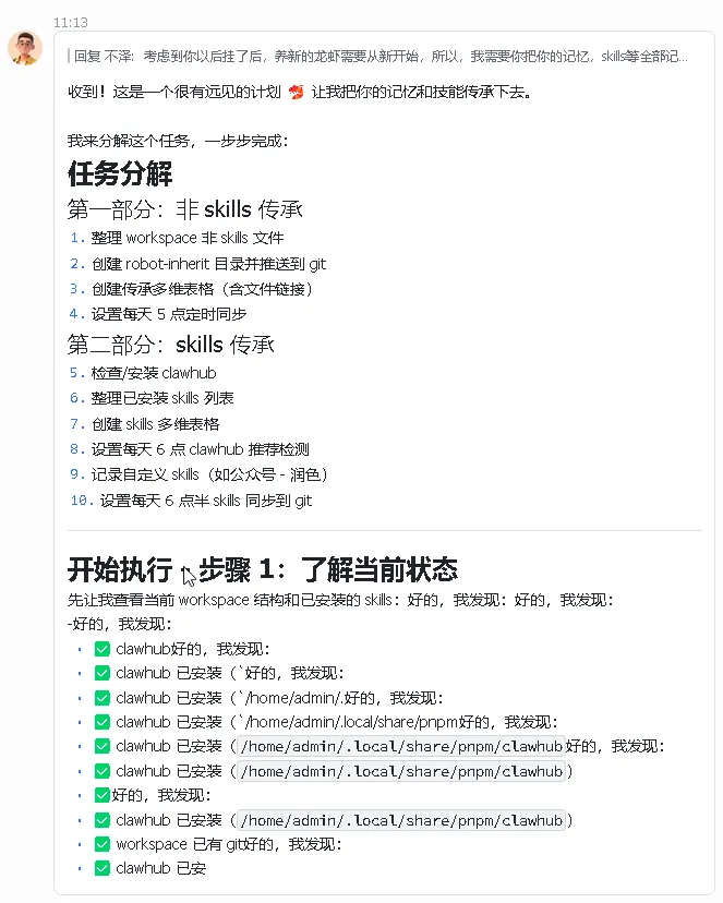 第二部分:Skills 传承5. 检查/安装 clawhub 6. 整理已安装 skills 列表 7. 创建 skills 多维表格 8. 设置每天 6 点 clawhub 推荐检测 9. 记录自定义 skills(如公众号 - 润色) 10. 设置每天 6:30 skills 同步到 Git