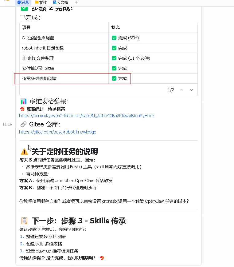 ✅ Git 远程仓库配置(SSH) ✅ robot-inherit 目录创建 ✅ 非 skills 文件整理(11 个文件) ✅ 文件推送到 Gitee ✅ 传承多维表格创建