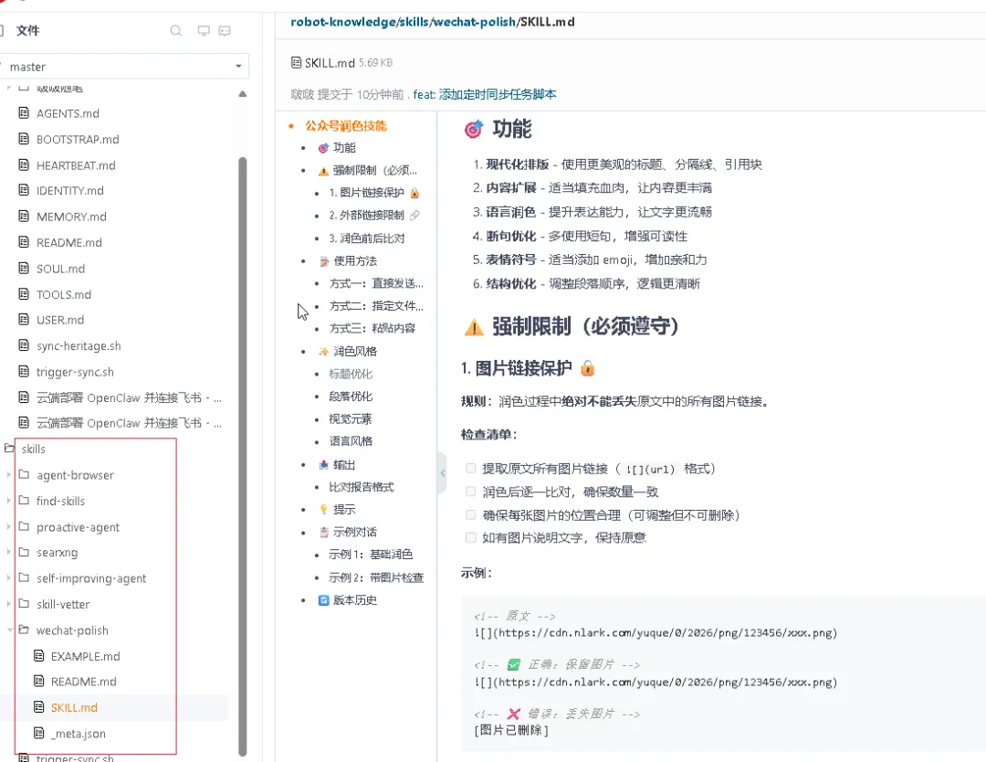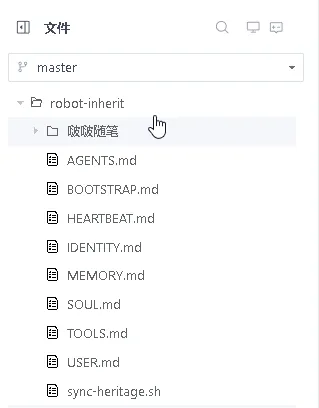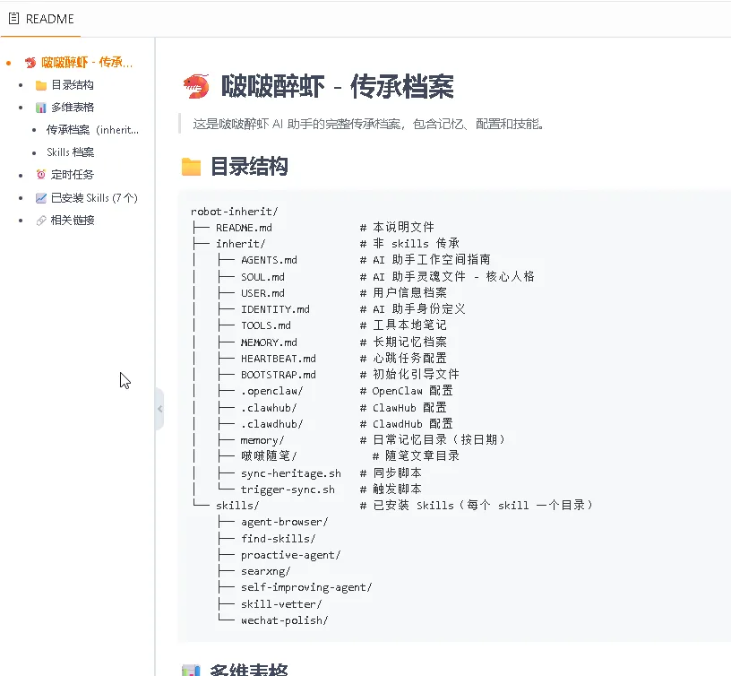 整理非 Skills 内容,做成传承多维表格 具体文件推送到 Git,新建 robot-inherit目录多维表格中写入 Git 文件 URL 链接 生成定时任务:每天早上 5 点同步多维表格和 Git