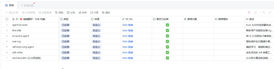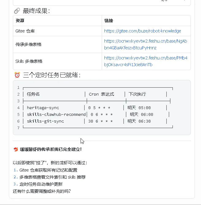 Gitee 仓库 - 获取所有记忆和配置 多维表格 - 查看文件索引和 skills 推荐 定时任务 - 自动维护更新