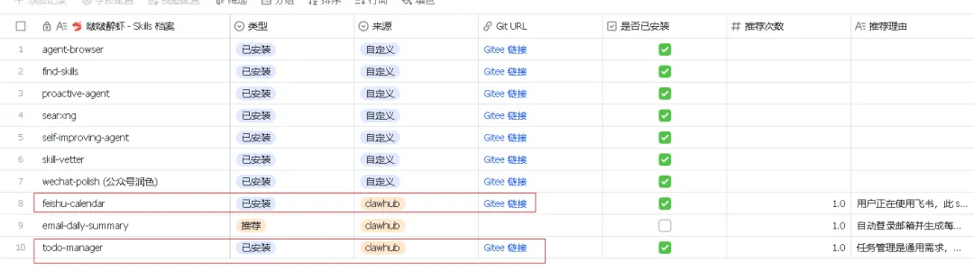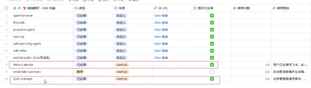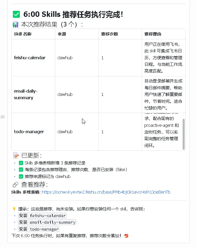 ✅ Skills 多维表格新增 3 条推荐记录 ✅ 每条包含推荐理由、推荐次数、是否已安装 ✅ 推荐来源标记为 clawhub