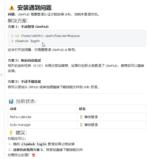 方案 1:手动登录 clawhub( clawhub login)方案 2:稍后自动重试(明天 6:00 任务) 方案 3:手动下载技能文件