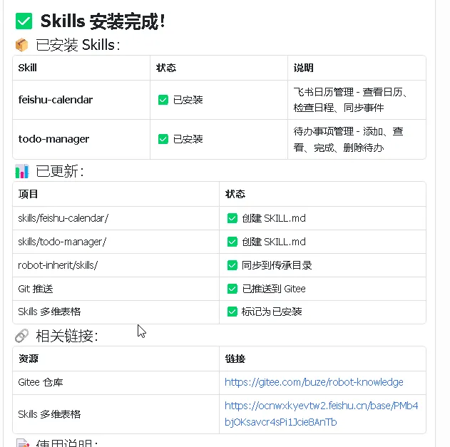 ✅ 创建 SKILL.md ✅ 同步到 robot-inherit/skills/ ✅ 推送到 Gitee ✅ Skills 多维表格标记为已安装