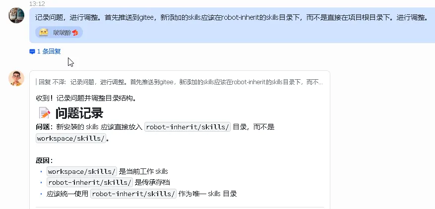 记录问题 调整目录结构 统一使用 robot-inherit/skills/作为唯一 skills 目录