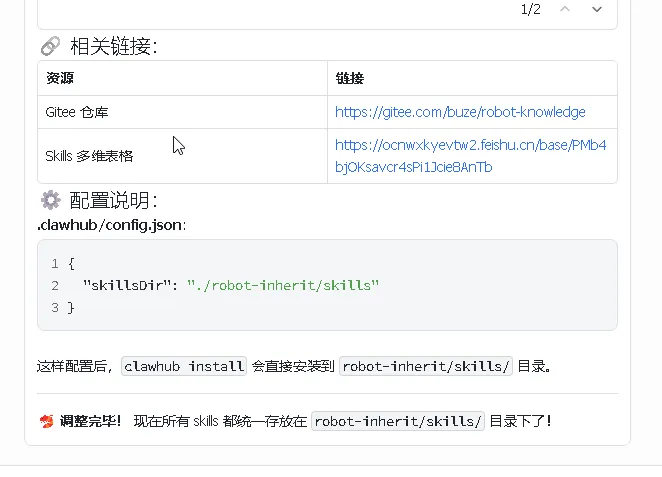 ✅ Gitee URL 链接已添加 ✅ 点击链接成功跳转 Gitee ✅ 所有 skills 统一存放在 robot-inherit/skills/