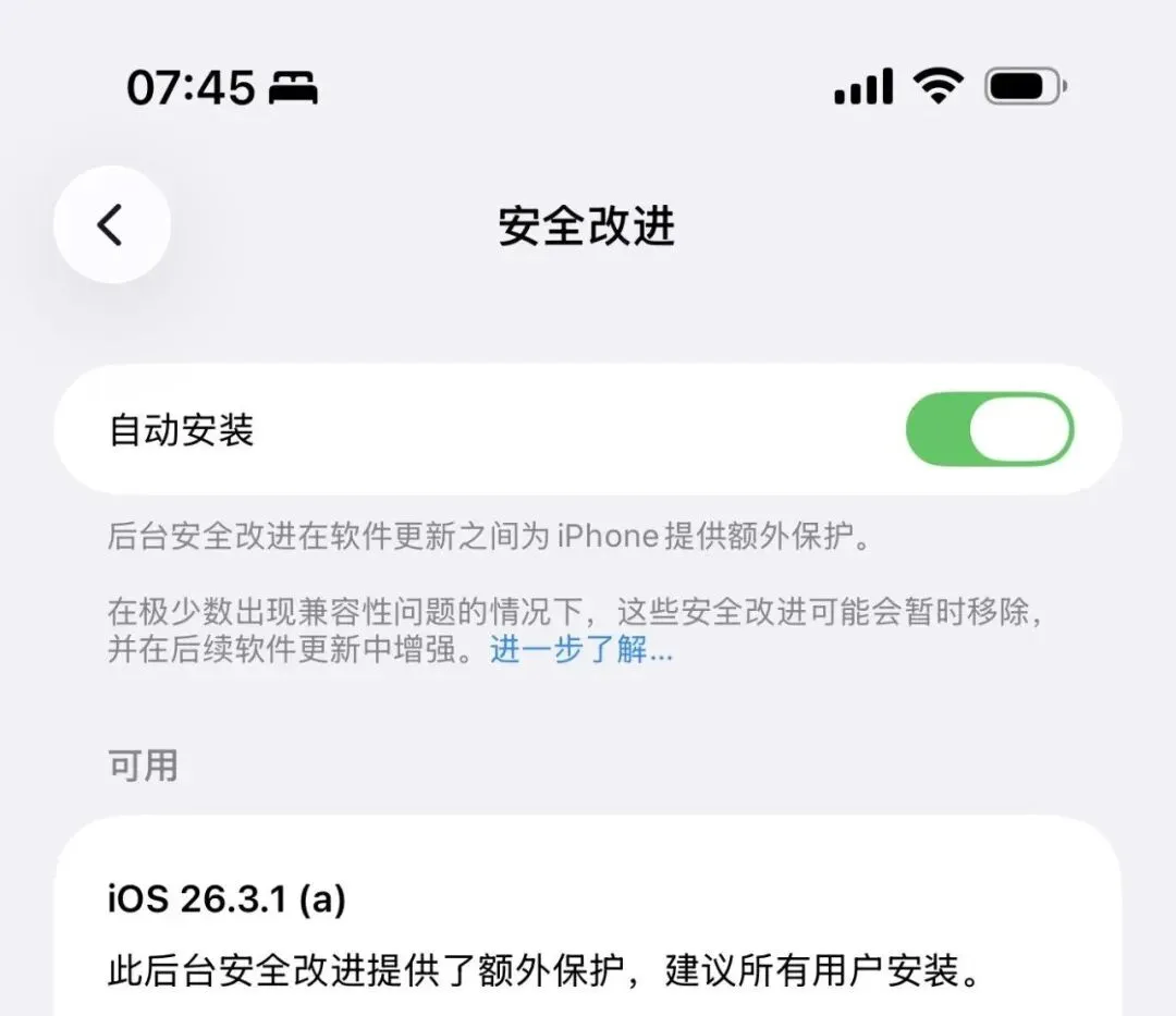 罕见,苹果突然推送iOS26新系统更新!今日凌晨,苹果突然推送了 iOS 26.3.1(a) 正式版系统,同时同步发布了 iPadOS 26.3.1(a)与 macOS 26.3.2(a) 版本,这是一次罕见的快速安全响应更新(RSR)。不同于常规系统版本迭代,本次更新属于苹果的快速安全响应机制,核心目的是在完整系统更新间隔期内,快速修复关键安全漏洞,主要针对 Safari、WebKit 等核心系统组件进行安全加固,不会新增功能或改变界面。本次更新安装包体积小,安装后设备重启后即可生效,不影响系统稳定性与性能。若你当前使用 iOS 26.3.1 正式版,建议及时安装本次安全补丁,以防范已知安全漏洞。如果你的设备是 iOS 26.3.1 版本,想要升级到该版本,需要手动进入「设置-隐私与安全性-后台与安全改进」才能看到更新。
