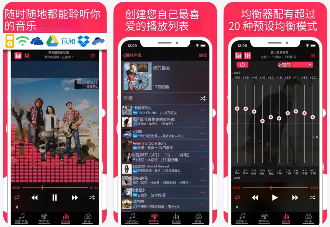 不仅支持无线传歌、离线下载,不用 iTunes 也能把音乐导进苹果设备,还有均衡器、低音助推器和 20 多种 EQ 预设,音质调校超合心意!