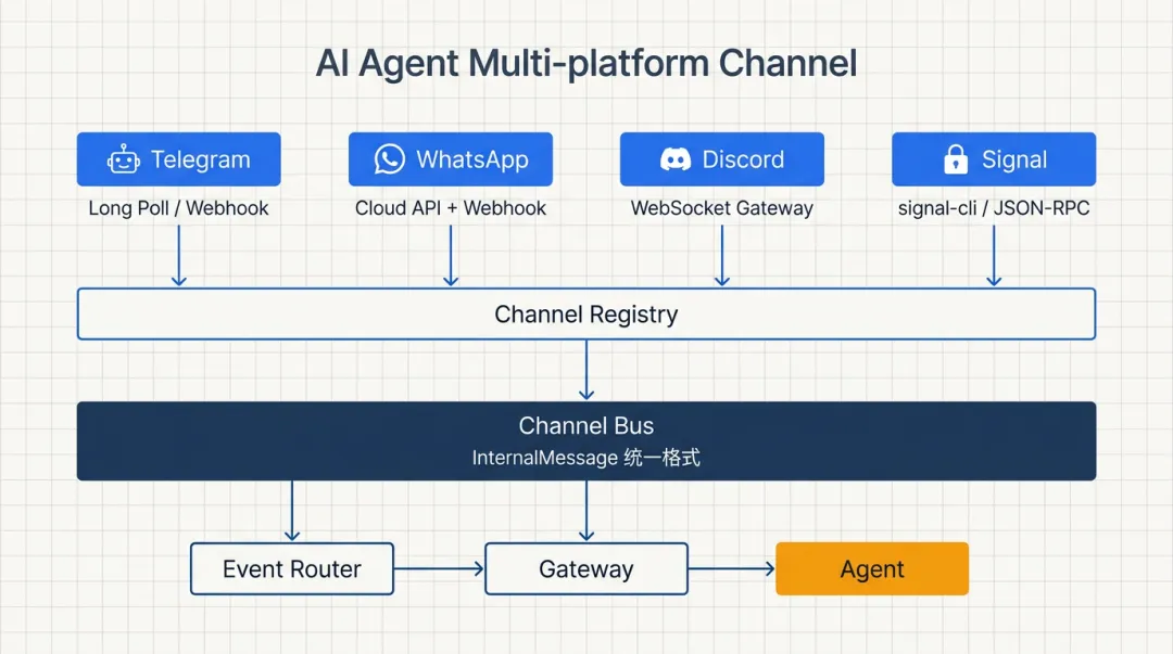 架构上,每个平台对应一个 Adapter,所有 Adapter 注册到 Channel Registry,通过统一的 Channel Bus 汇入 Gateway 的 Event Router。