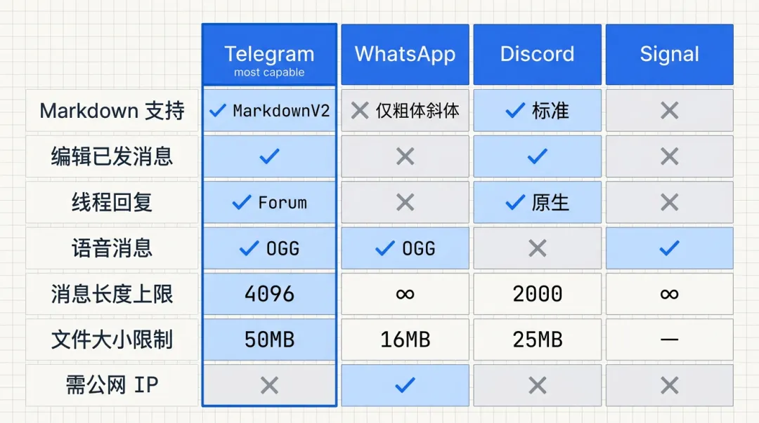 Telegram 的 MarkdownV2 是个坑——_*[]()~\>#+-=|{}.!` 这些字符全要转义,否则消息直接发送失败。OpenClaw 在格式转换层统一处理。