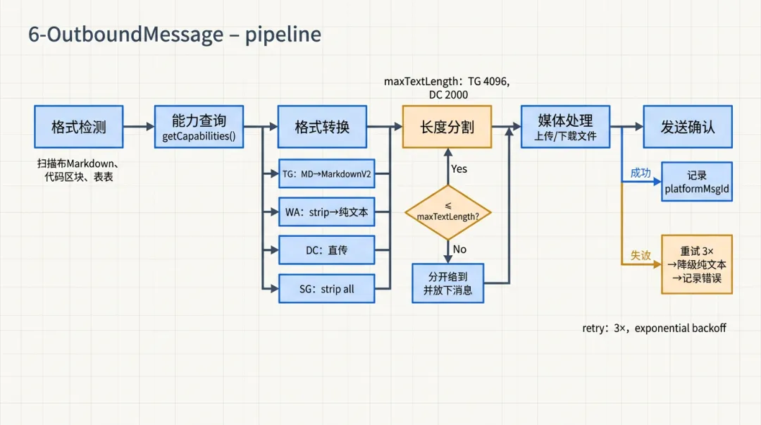 [6] 发送 + 确认 — 成功了记录 platformMessageId(后续编辑用),失败重试 3 次(指数退避),仍失败降级纯文本再试,最终失败记错误日志。