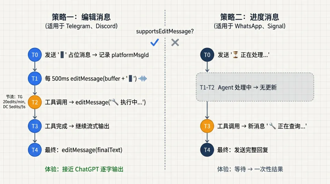 [1] 发送初始消息 "▍"(光标占位)→ 记录 platformMsgId[2] 流式文本累积到 buffer[3] 每 STREAM_THROTTLE_MS(500ms): editMessage(platformMsgId, buffer + "▍")[4] 工具调用开始 → editMessage(..., buffer + "\n🔧 执行中...")[5] 工具调用完成 → 新一轮流式输出[6] 最终完成 → editMessage(platformMsgId, finalText)体验接近 ChatGPT 的逐字输出效果。