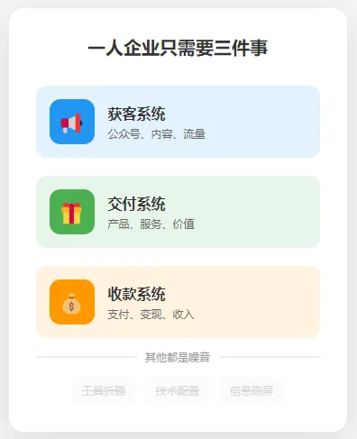 一人企业只需要三件事:获客系统、交付系统、收款系统。其他都是噪音。