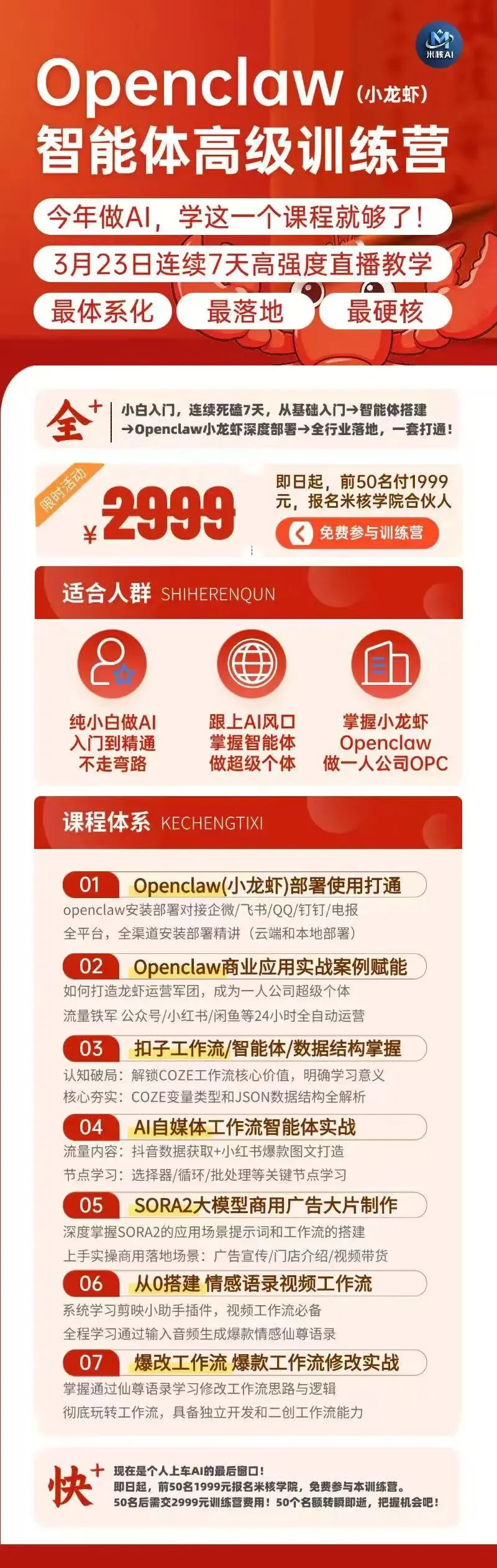 3月23日起,连续死磕7天直播教学,从基础入门,到智能体搭建,再到Openclaw小龙虾的深度部署和各行业应用!