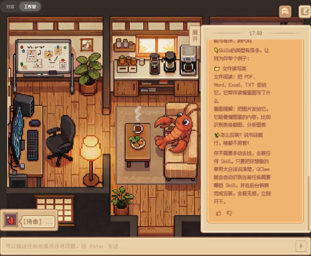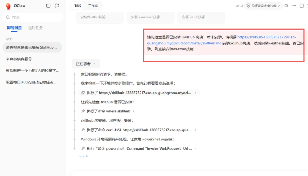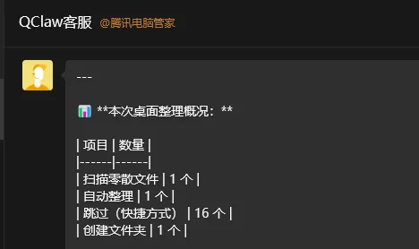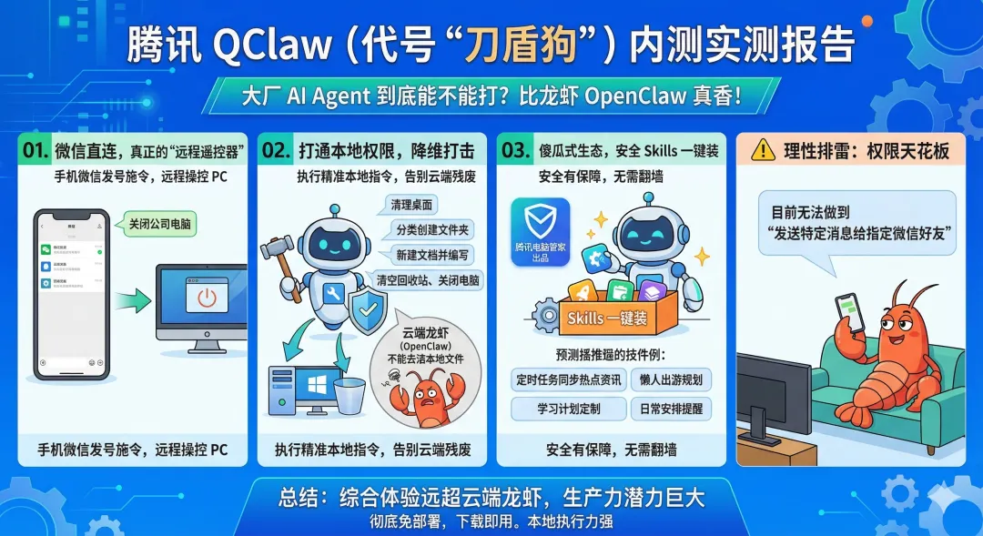 腾讯QClaw内测首发体验:微信一句话关电脑,彻底治好了我的“AI焦虑”各位老铁,今天终于顺利拿到了腾讯QClaw的内测资格!作为一个喜欢折腾新工具的人,我火速给它起了个专属代号——“刀盾狗”,并进行了一番深度实测。说实话,因为之前我曾花过199元去折腾部署Kimi版本的OpenClaw,这次体验完腾讯的QClaw后,最直观的感受就两个字:真香。今天不讲虚的,直接给大家交一份最接地气的“刀盾狗”实测报告,看看这款背靠大厂的AI新锐到底能不能打。👇📱 01. 杀手锏:微信直连,真正的“远程遥控器”这是我认为QClaw目前最具不可替代性的王炸功能——它可以直接关联微信。就冲这一点,它的实用价值就拉满了。你可以直接在微信上对它发号施令,进行远程操控。举个最实在的例子:下班走到半路,突然想起公司电脑没关?直接在微信上给“刀盾狗”发一条消息,电脑就能自动关机。这种打破PC与移动端壁垒的体验,非常顺滑。💻 02. 降维打击:打通本地权限,告别“云端残废”之前花199元部署的Kimi版龙虾,最大的痛点就是:受限于云端部署和系统隔离,它有大量的本地操作是根本做不到的(比如清空回收站、关机等,它只能干瞪眼)。但QClaw在本地权限的接管上,做到了真正的降维打击。在今天的实测中,我可以直接让它:清理电脑桌面自动创建分类文件夹新建文档并按我的要求进行编写清空回收站、关闭电脑这些指令它都能顺利且精准地执行。你需要的,仅仅是像和朋友聊天一样,在微信上给它发个语音或文字。🛠️ 03. 傻瓜式生态:告别折腾,Skills一键装折腾过AI Agent的朋友都知道,到处找好用的插件(Skills)、翻墙下载、还要担心植入木马,是一件极其痛苦的事。QClaw直接把这个门槛踩平了:自带安全背书:界面上标明了是腾讯电脑管家出品,在系统安全和插件审核上,大厂的底线还是相对有保障的。一键傻瓜式安装:你只需要问它“市面上有哪些好用的Skills”,它不仅会帮你推荐,还能按照指引自动帮你安装好,全程不需要翻墙,省时省力。高频场景预装:极其人性化地预装了日常刚需技能,比如:定时任务同步热点资讯、懒人出游规划、学习计划定制、日常安排提醒等,开箱即用。顺便提一句,它的UI设计非常生动——后台是一只躺着看电视、悠然自得的龙虾。你只需弹指下达指令,活儿它就在后台悄无声息地干完了。⚠️ 04. 理性排雷:目前的权限天花板当然,第一天的实测也发现了一些暂未打通的局限。比如,当我尝试让它“发送特定的消息给指定的微信好友”时,目前它还无法做到。盲猜这涉及到了微信极高的隐私合规底线以及社交接口的权限控制,官方在这方面的步子迈得还是比较谨慎的。📝 总结从首日的实测感受来看,QClaw的综合体验已经远超我之前手动部署的云端龙虾。彻底免去了繁琐的部署步骤,下载安装即可一键使用,本地执行力极强。虽然目前我只是把它当成一个“高级远程脚本”在用,但它背后可挖掘的生产力潜力绝对是巨大的。总结:
