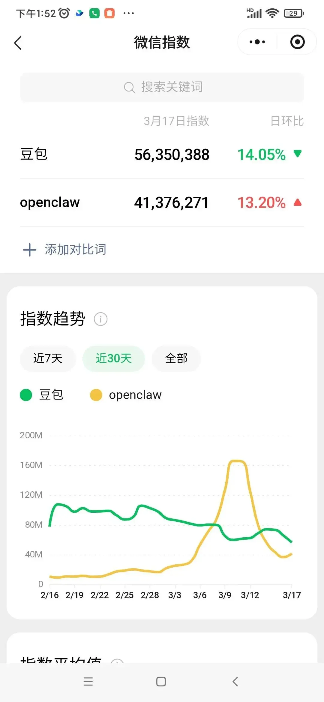 再看微信指数——OpenClaw从3月初的1.6亿峰值,快速回落到4138万,跌幅超过70%。