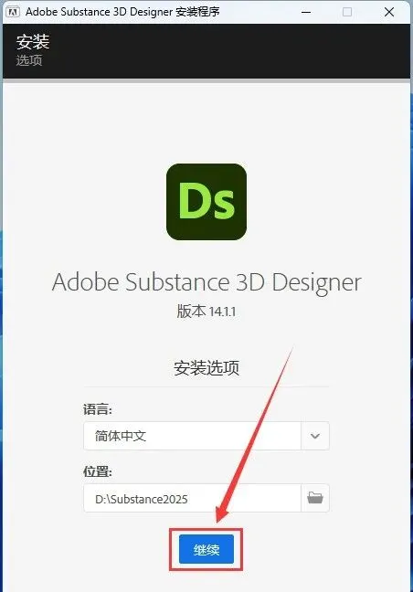 5.修改安装位置:①点击需要将软件安装的磁盘位置(如:D盘)②新建一个【Substance2025】文件夹并选中③点击【确定】。