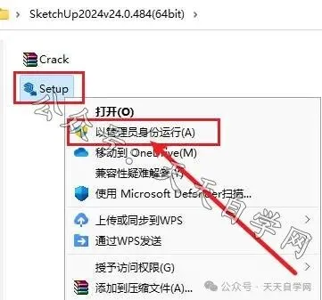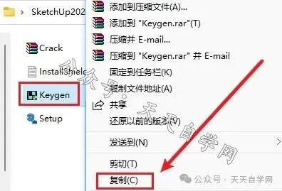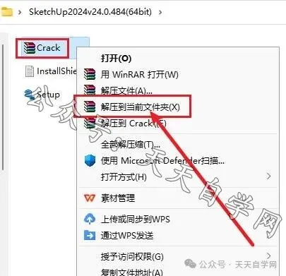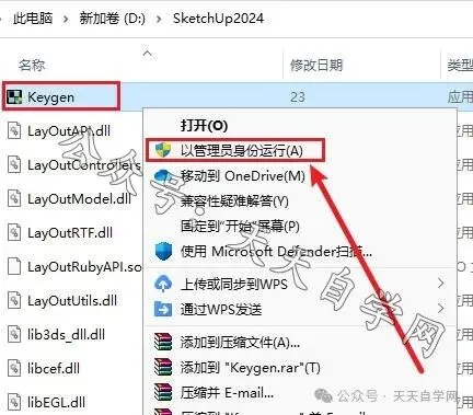 提示:安装包下载完解压前关闭杀毒软件安全卫士及防火墙。1.选中下载好的安装包,点击鼠标右键解压到.....。2.选中setup文件,点击鼠标右键选择以管理员身份运行。4.选择要安装的盘符,点击新建文件夹,将新建的文件夹重命名为SketchUp2024并鼠标光标选中此文件夹,点击确定。8.安装包内选中Crack压缩文件,点击鼠标右键选择 解压到当前文件夹。9.选中解压出来的Keygen文件,点击鼠标右键选择复制。10.鼠标右击桌面SketchUp2024图标,点击鼠标右键选择打开文件所在的位置。12.鼠标右击粘贴后的Keygen文件,选择以管理员身份运行。注:我们提供的所有内容均来自互联网,仅限学习与交流使用,不得用做商业用途,下载学习完后,请24小时内删除,如有侵权请联系我们及时处理