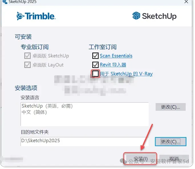 4、取消勾选V-ray,不然后面可能会出问题,然后点开始安装