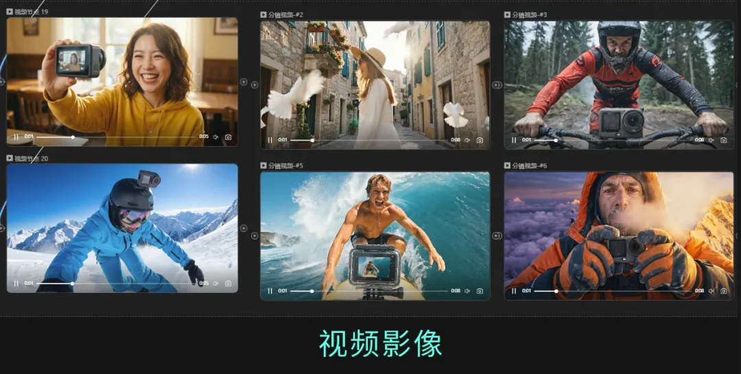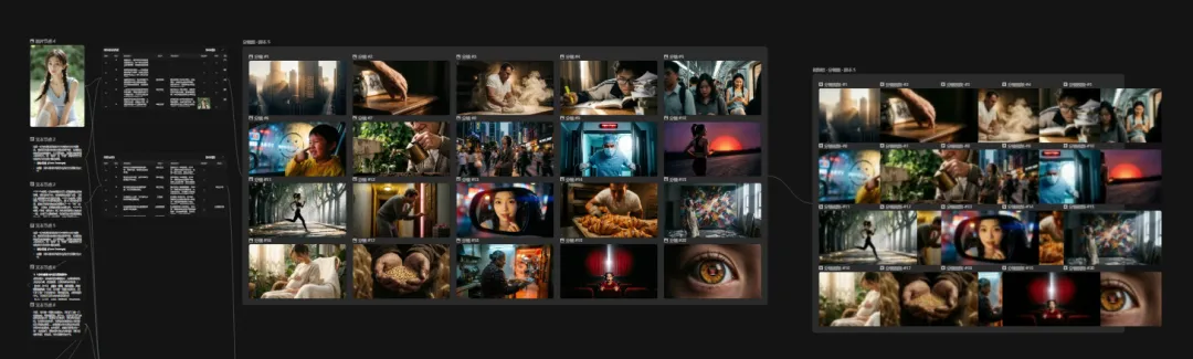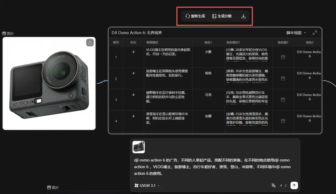 简单地说就是:一个画布,整个项目。从创意剧本,分镜脚本,镜头修改,视频生成,配音配乐,完整创作流程都可以在同一块画布里完成。
