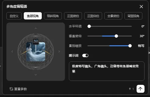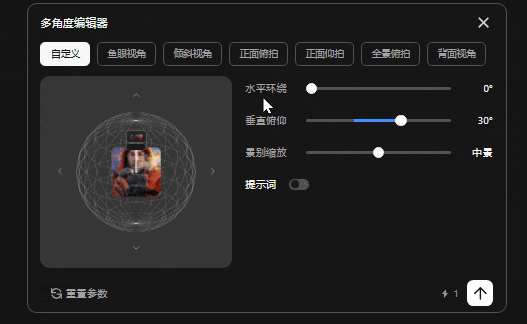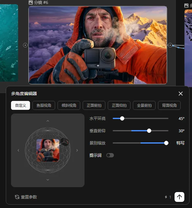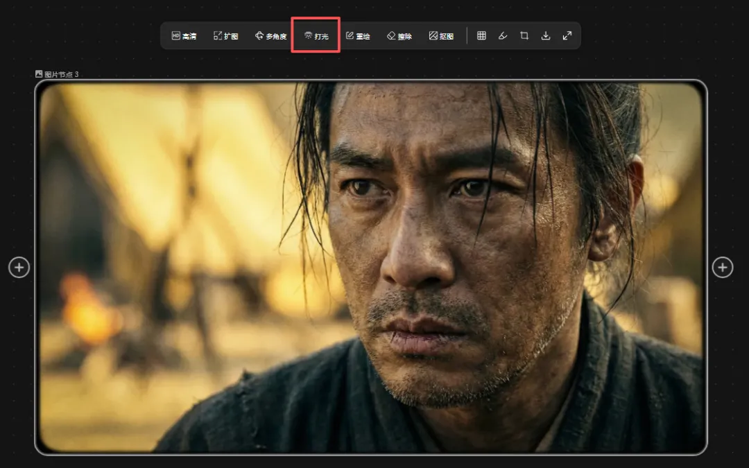 这样就可以轻松修改每一个镜头的画面。选中图像,图像上方是一些常用工具命令,高清,多角度,灯光,抠图等等,例如点击多角度。