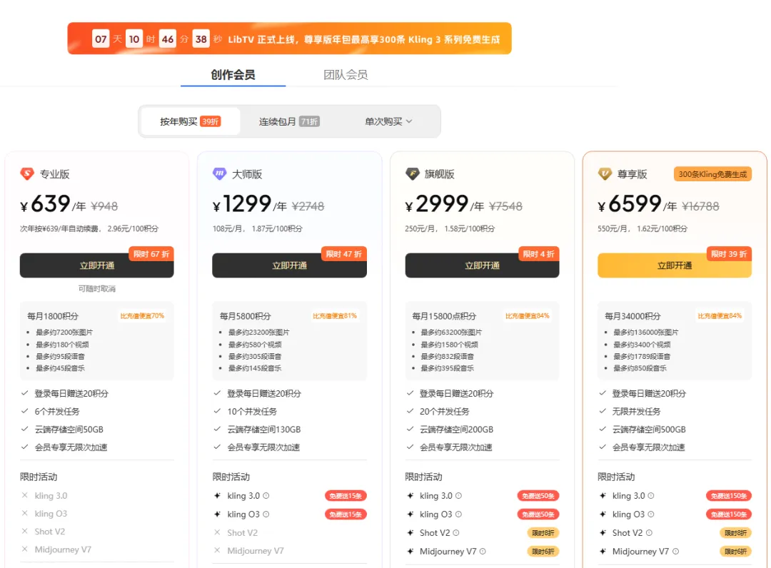 方法2,39 折的年卡你可以拥有。目前有送150条可灵O3+150条可灵3.0,共300条免费视频。
