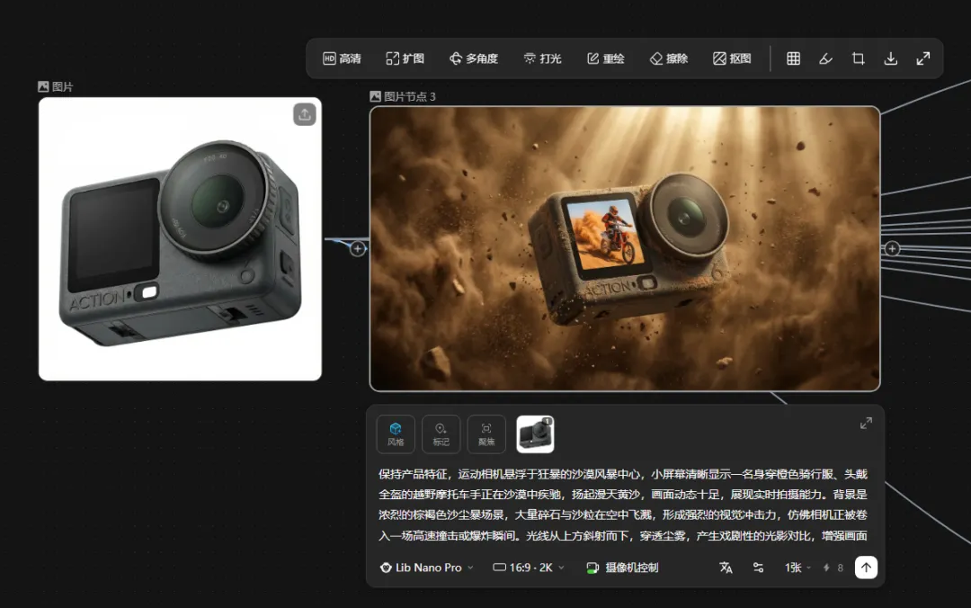 图像工具的增强、扩图、多角度、打光、重绘、擦除、抠图、宫格切分、标注、裁剪,覆盖了从灵感草图到交付级画面的绝大部分操作。创作时的小修改、小微调,不再需要导出到别的软件里折腾。