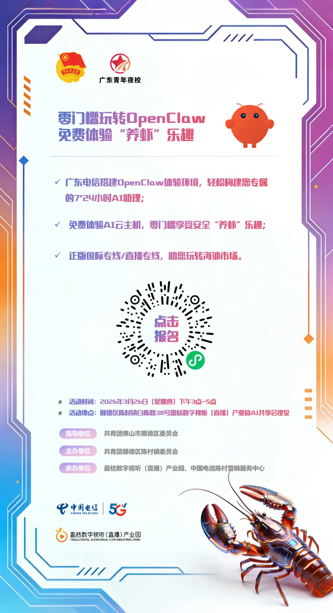 本次培训,盈桔课堂联动中国电信,零门槛玩转OPENCLAW,不仅免费培训,还送2500万token。还等什么,赶紧约起吧~