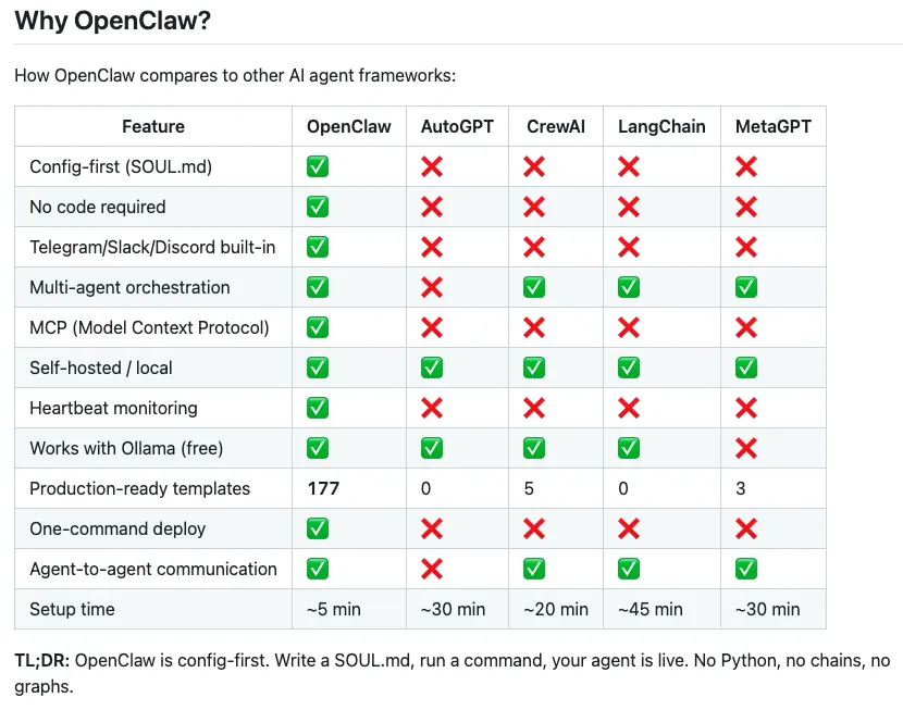 更现实的一点是,它不只是在卖“模板感”。仓库里直接把 OpenClaw 和 AutoGPT、CrewAI、LangChain、MetaGPT 做了对比,主打的就是 config-first、少代码、启动快。你未必认同这个比较,但至少它戳中了一个很真实的需求:很多团队现在缺的不是“再来一个 Agent 理论”,而是一个今天就能先跑、明天就能改的雏形。