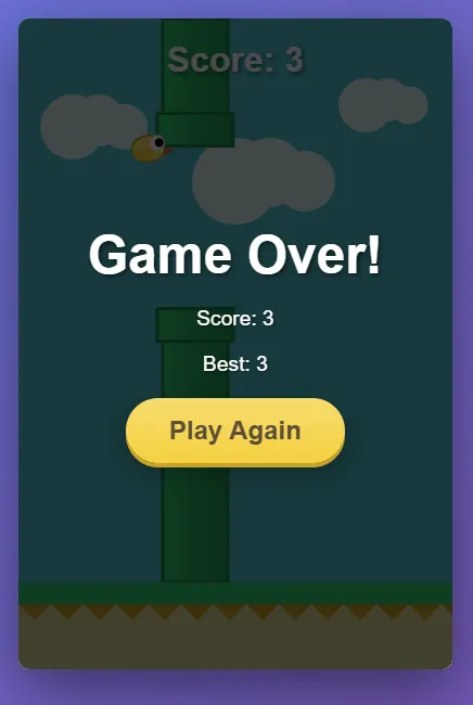 经典 Flappy Bird 玩法(点击/空格键操控) 桌面端与移动端响应式设计 使用 localStorage 记录最高分 基于 Canvas 的流畅动画渲染 小鸟、管道、云朵与地面图形 请求日志:
