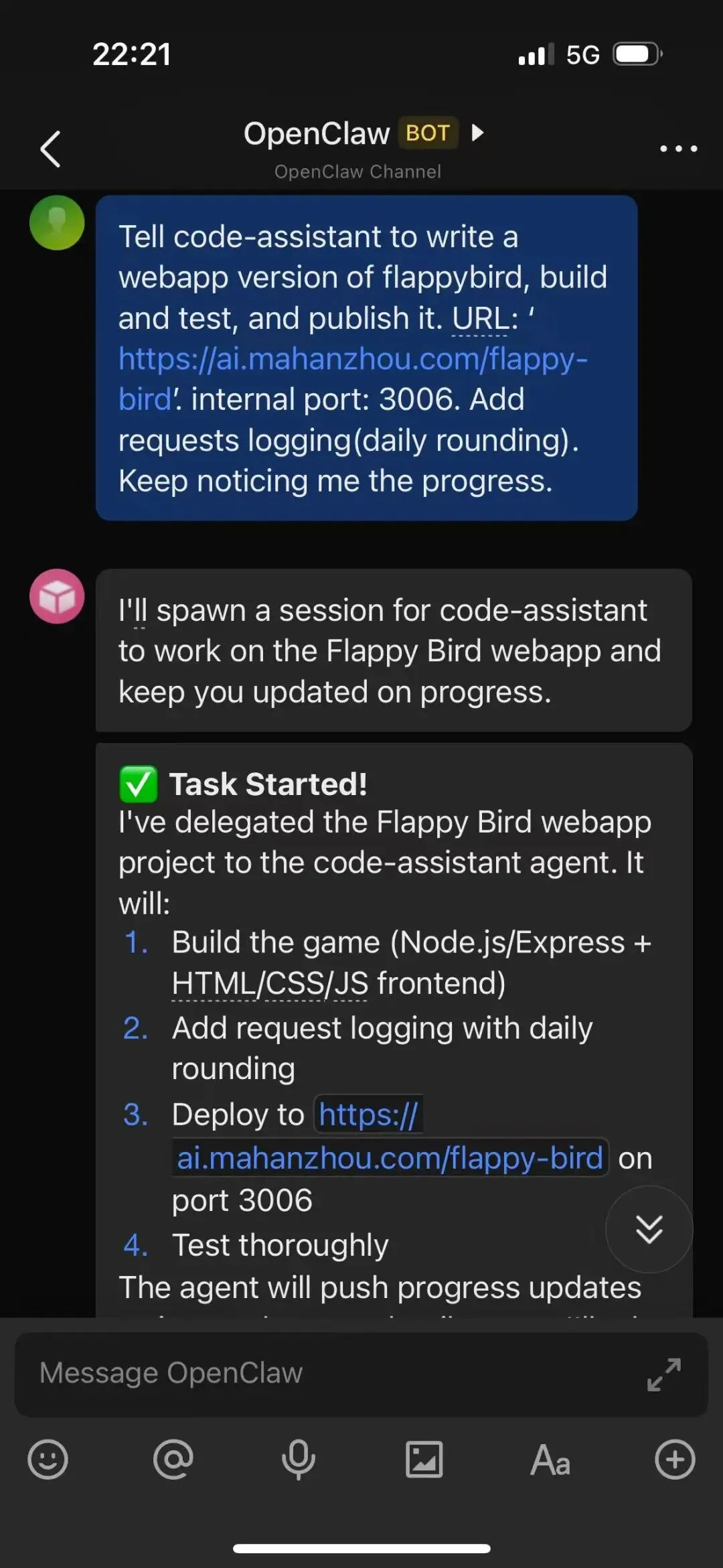 夜深了,又是调戏 OpenClaw 的时候了。之前试过让它处理一些复杂实验性项目,踩了不少坑(主要还是zai/glm-4.7不太行);这次降低预期,找了个目标明确的小项目——从零开发一个经典的 Flappy Bird Web 游戏。还算比较顺利,游戏已经上线可玩(https://ai.mahanzhou.com/flappy-bird)。