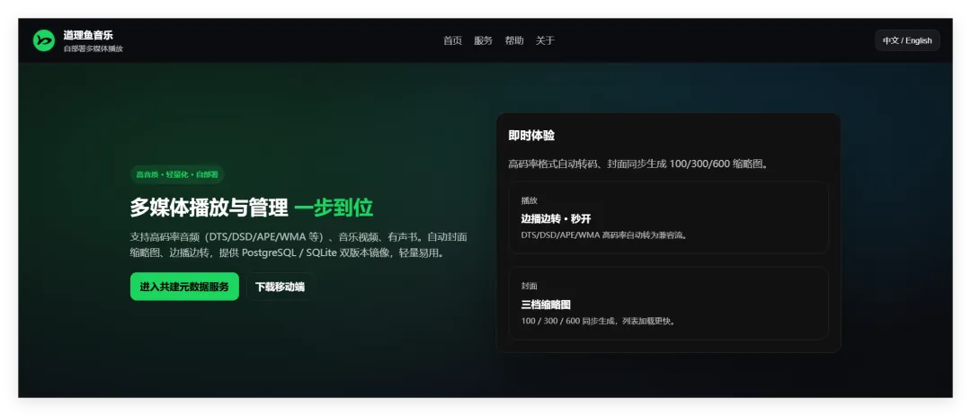 自部署多媒体方案,主打高音质、轻量化,适配个人 / 私有部署场景 支持 DTS/DSD/APE等多格式,高码率自动转码、边播边转秒开,兼顾音质与播放速度自动扫描媒体库,解析元数据,同步生成 100/300/600三档封面缩略图提供 PostgreSQL/SQLite双镜像,内置Redis轻量模式,轻量化部署、拉起即用统一管理音乐、视频、有声书,整合播放、管理、转码全链路功能 支持移动端,可获取专属安装包实现随时随地播放 操作简单,登录即可使用,配套常见问题解答与支持渠道