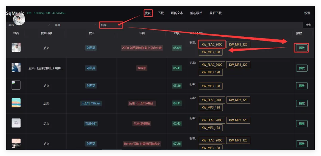 进来后可以点击上面的搜索,输入歌曲名或者歌手名开始搜索,在搜索结果的后面有个播放,点击就能在线播放音乐,前面有个码率下载,可以选择你要下载的码率,点击就自动下载。
