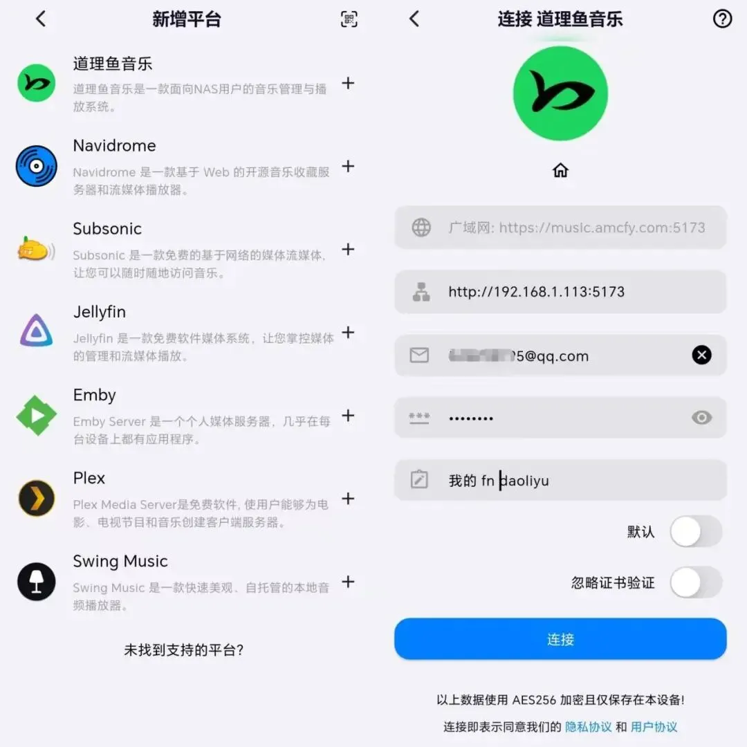 安装好后打开客户端,自动弹出新增平台,点击道理鱼音乐,输入道理鱼的访问地址(比如http://localhost:5173)、自己的公网域名+IP,或者通过cloudfare tunnels、节点小宝等软件处理后的公网域名,这样就可以在外网也能使用;