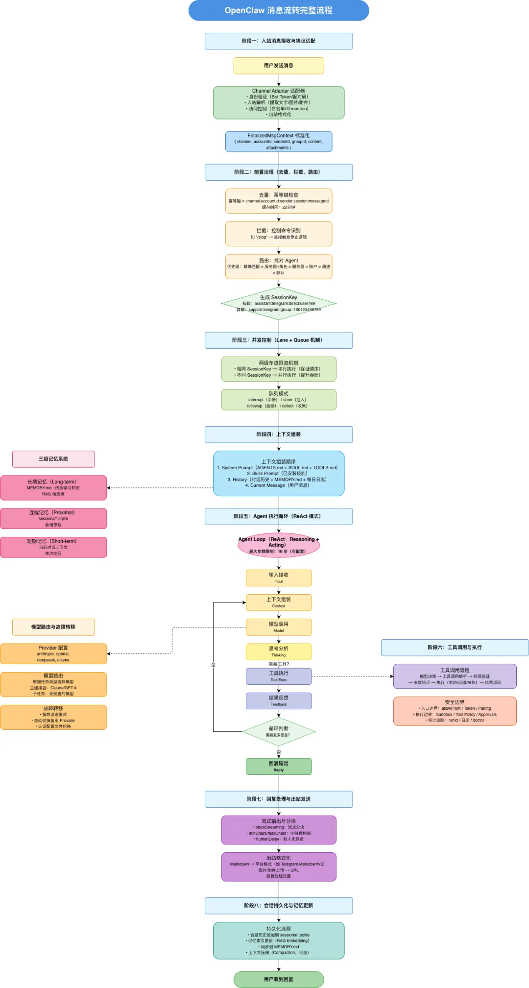 SessionKey 格式示例:- 私聊:assistant:telegram:direct:user789- 群聊:support:telegram:group:-100123456789作用:1. 会话隔离:不同会话完全独立,互不干扰2. 并发控制:相同 SessionKey 的消息串行处理