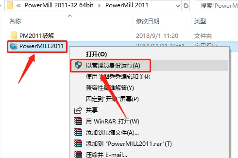 4.选中【PowerMILL2011】安装程序,鼠标右击选择【以管理员身份运行】。如下图所示:
