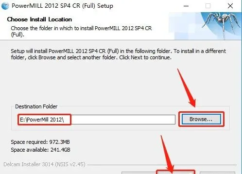 7.点击【Browse】设置软件的安装路径,建议安装到除C盘以外的磁盘,可在E盘或其它盘里面新建一个【PowerMill 2012】文件夹,然后点击【Next】。