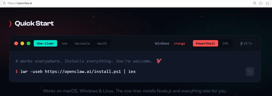 Mac/Linux 用户小贴士:安装命令略有不同,可以访问 OpenClaw 官网(openclaw.ai)查看对应的安装指令。