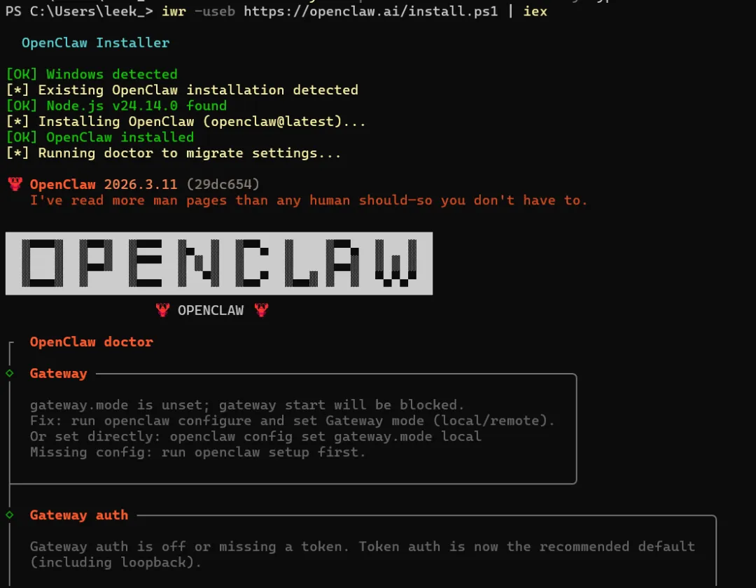 powershell -c "irm https://openclaw.ai/install.ps1 | iex"这条指令会自动下载并运行官方安装脚本 ,需要耐心等待10~20分钟,看到满屏的绿色日志滚动完毕,就代表安装成功。