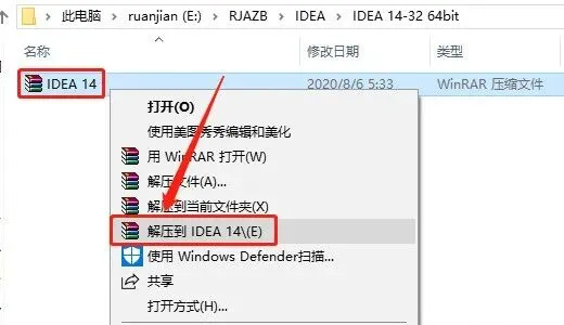 1.打开下载的软件安装包,鼠标右击【IDEA 14】压缩包,选择【解压到IDEA 14】。