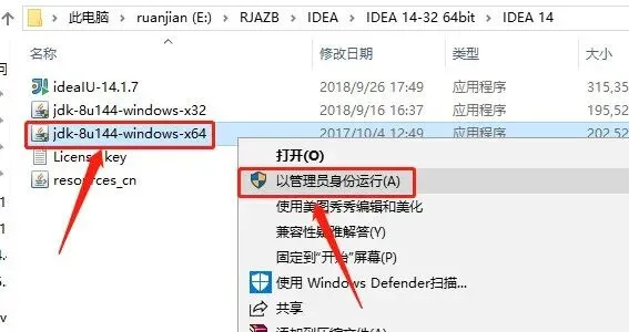 5.此教程中以Win10 64位操作系统,win7,win8操作步骤与此相同,鼠标右击【jdk-8u144-windows-x64】安装程序,选择【以管理员身份运行】。