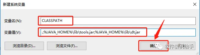 18.输入变量名CLASSPATH,变量值.;%JAVA_HOME%\lib\tools.jar;%JAVA_HOME%\lib\dt.jar,输入好后点击【确定】。